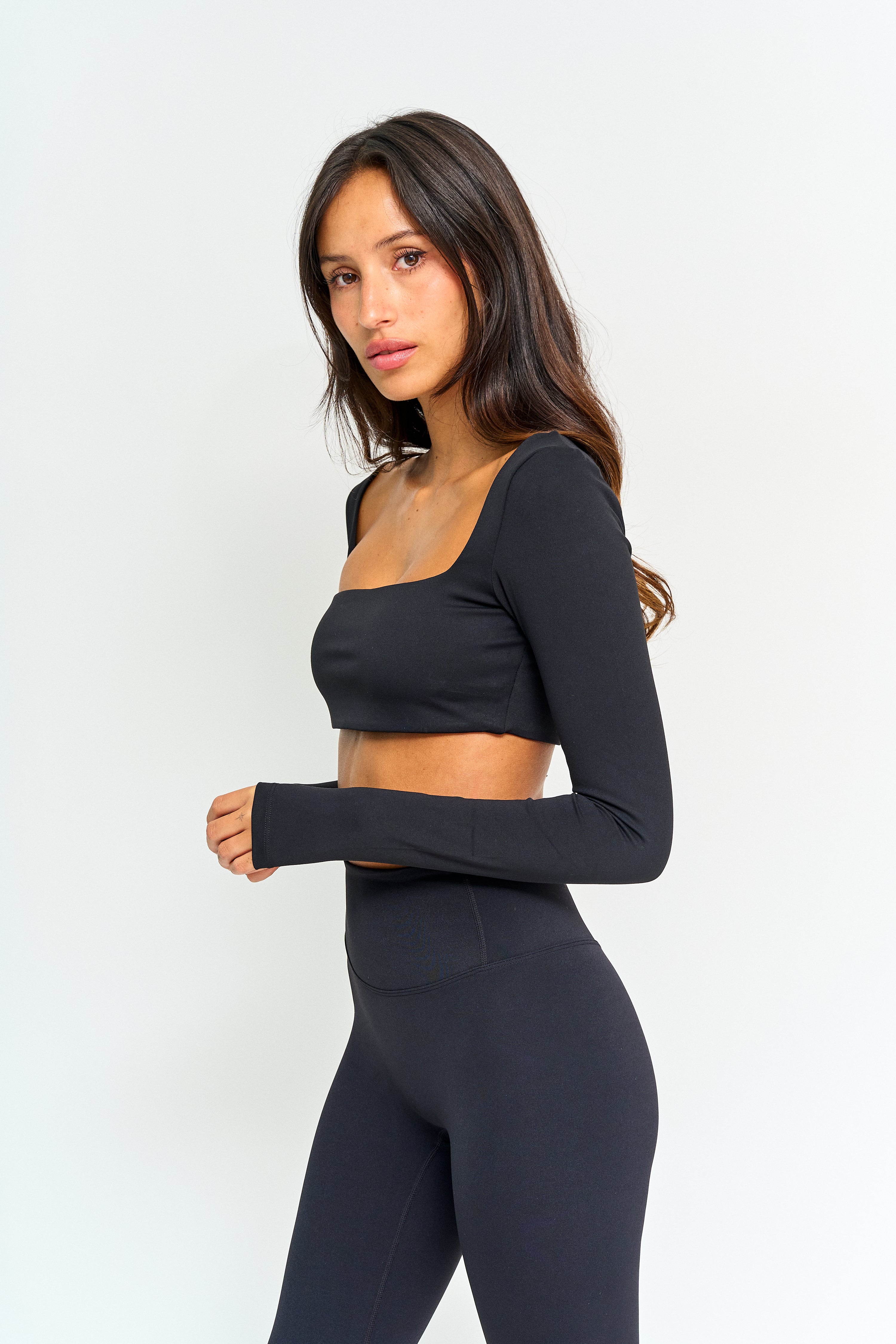 La mezcla ideal entre elegancia y funcionalidad. Su diseño de manga larga y hombros cubiertos crea una silueta estilizada y moderna, manteniéndote cómoda y firme en cada movimiento. El fit es corto, perfecto para combinar con calzas tiro alto y lograr ese look deportivo–chic que tanto amamos.